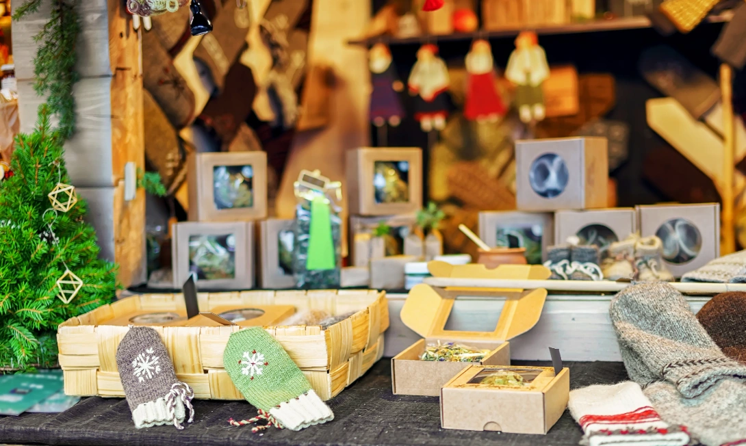 Artisan crafts and holiday items on display at an Ohio market stall.